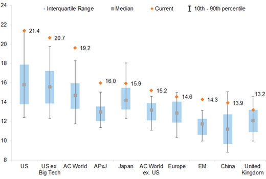 The US market is experiencing the most extreme valuations, in both absolute and relative terms.