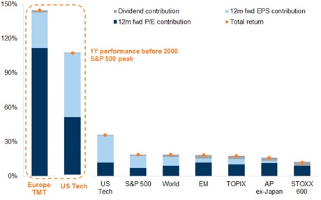 One reason why valuations are probably not yet at bubble levels is to compare returns in this past year – disaggregated between earnings, valuation and dividends – with returns in the 12-months before the peak in the dot-com bubble. Back in 1999/2000, there was a much greater rise in valuation driven by multiple expansion rather than by earnings growth. And for European telecoms the valuation ascent was even steeper, with returns driven almost entirely by valuation rather than earnings. Today, earnings growth has been the primary factor driving rising prices.