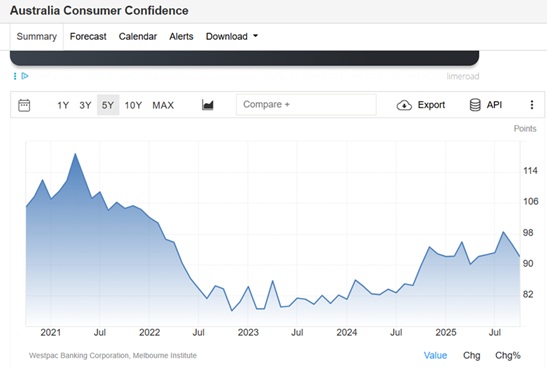Australia’s Westpac-Melbourne Institute Consumer Sentiment Index decreased to 92.1 in October from 95.4 in the previous month, falling 3.5% and marking the lowest reading in five months. Consumer Confidence in Australia averaged 100.23 points from 1974 until 2025, reaching an all-time high of 123.90 points in May of 2007 and a record low of 64.60 points in November of 1990.