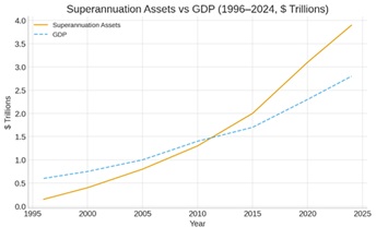 Australia’s compulsory superannuation system has created an investment behemoth of staggering proportions. As of September 2024, total superannuation assets reached approximately $3.9 trillion, representing roughly 140% of Australia’s GDP. This figure has grown exponentially from $148 billion in 1996, demonstrating a compound annual growth rate exceeding 12% over nearly three decades.