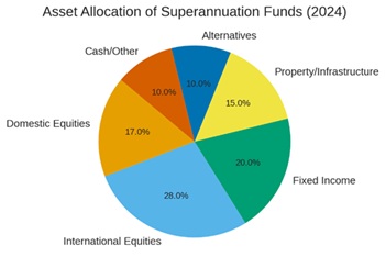 Australian superannuation funds deploy capital across diversified portfolios, but their sheer magnitude creates structural market impacts. As of 2024, approximately 45% of superannuation assets are invested in equities—roughly $1.75 trillion. Of this, domestic Australian equities make up approximately $600-650 billion, while international equities account for $1.1-1.15 trillion.