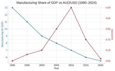 Australia’s manufacturing sector has contracted dramatically, falling from 13% of GDP in 1990 to just 5.5% in 2024. Employment in manufacturing has declined from 1.3 million workers in 1990 to approximately 900,000 today, despite population growth of 60% over this period.