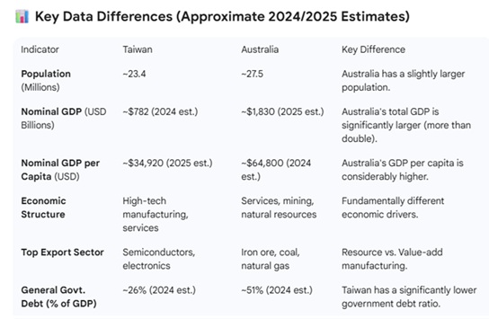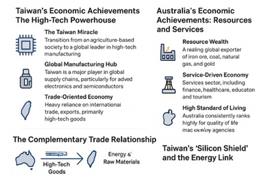 - Economic Foundation: Taiwan’s economy is built on human capital, innovation, and value-added manufacturing (e.g. silicon chips), while Australia’s is founded on natural resources and its services sector.