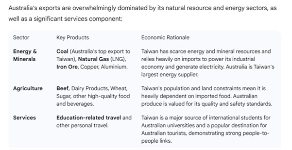 Diversification: For Australia, the trade relationship with Taiwan provides a high-value complementary market for its resources, helping diversify its export risk across the Asian region.