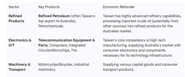 - Trade Focus: Australia exports raw materials and energy (coal, iron ore, gas) to Taiwan, which in turn exports finished and intermediate high-tech products (refined petroleum, telecom equipment, computers) to Australia.