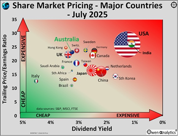 The chart above is a great example of his work, providing an update on share market pricing around the world, based on the two most widely used measures – price/earnings ratios (he uses historic or trailing earnings rather than future earnings) and dividend yields. The chart plots share market pricing for the 20 largest share markets in the world (which together account for more than 95% of total global share market value), and the size of the symbol for each country represents the relative size (market cap) of each country’s share market.